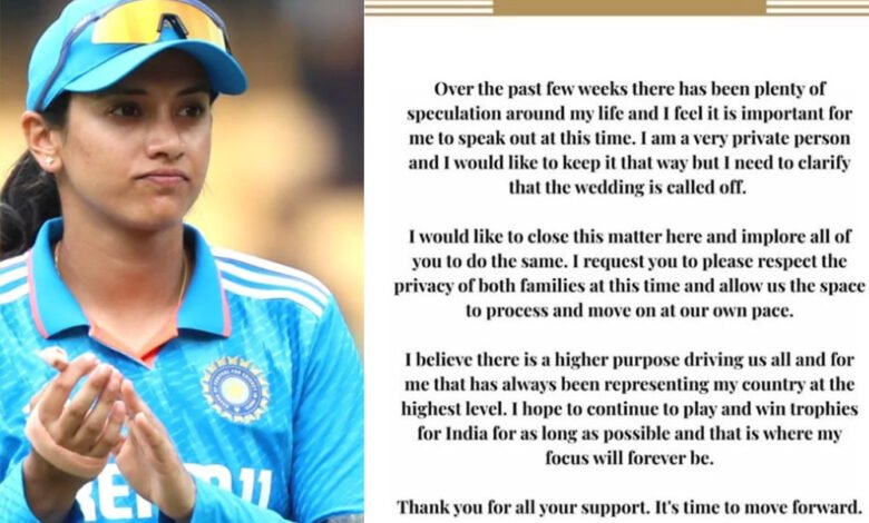 पोखरा स्पोर्ट्स । भारतीय महिला क्रिकेटर स्मृति मन्धनाले पलाश मुच्छलको विवाह सधैका लागि रद्ध भएको बताएकी छन् । आइतबार एक विज्ञप्तिमार्फत स्मृतिले आफुहरुको विवाह रद्ध भएको स्पष्ट गर्दै यस विषयलाई अब बन्द गर्न चाहेको बताएकी हुन् ।
