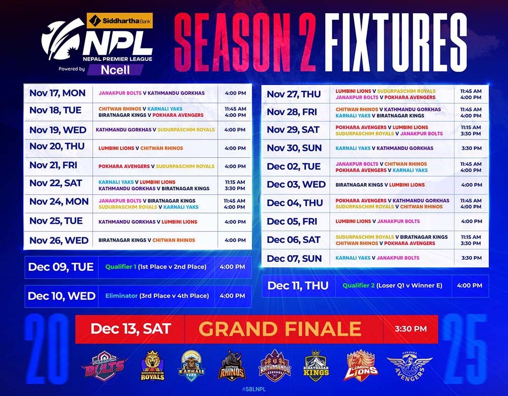 पोखरा स्पोर्ट्स ।  नेपाल क्रिकेट संघ (क्यान) ले नेपाल प्रिमियर लिग (एनपीएल) को दोस्रो सिजनको खेल तालिका सार्बजनिक गरेको छ ।