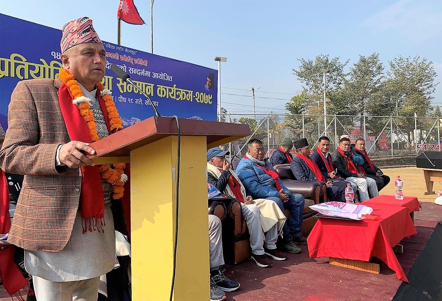 सम्मानित व्यक्तित्व अग्रज पत्रकार पत्रकार नारायण कार्कीले खेलकुदको विकासका लागि लागि प्रयाप्त लगानी आवश्यक रहने कुरामा जोड दिए । “हामीले १० वटा अस्पताल बनाउनु भन्दा एउटा उच्चस्तरिय खेल मैदान बनाउन जोड दिनु पर्छ तब मात्रै नागरिक स्वस्थ र जागरुक बन्छन् ।”