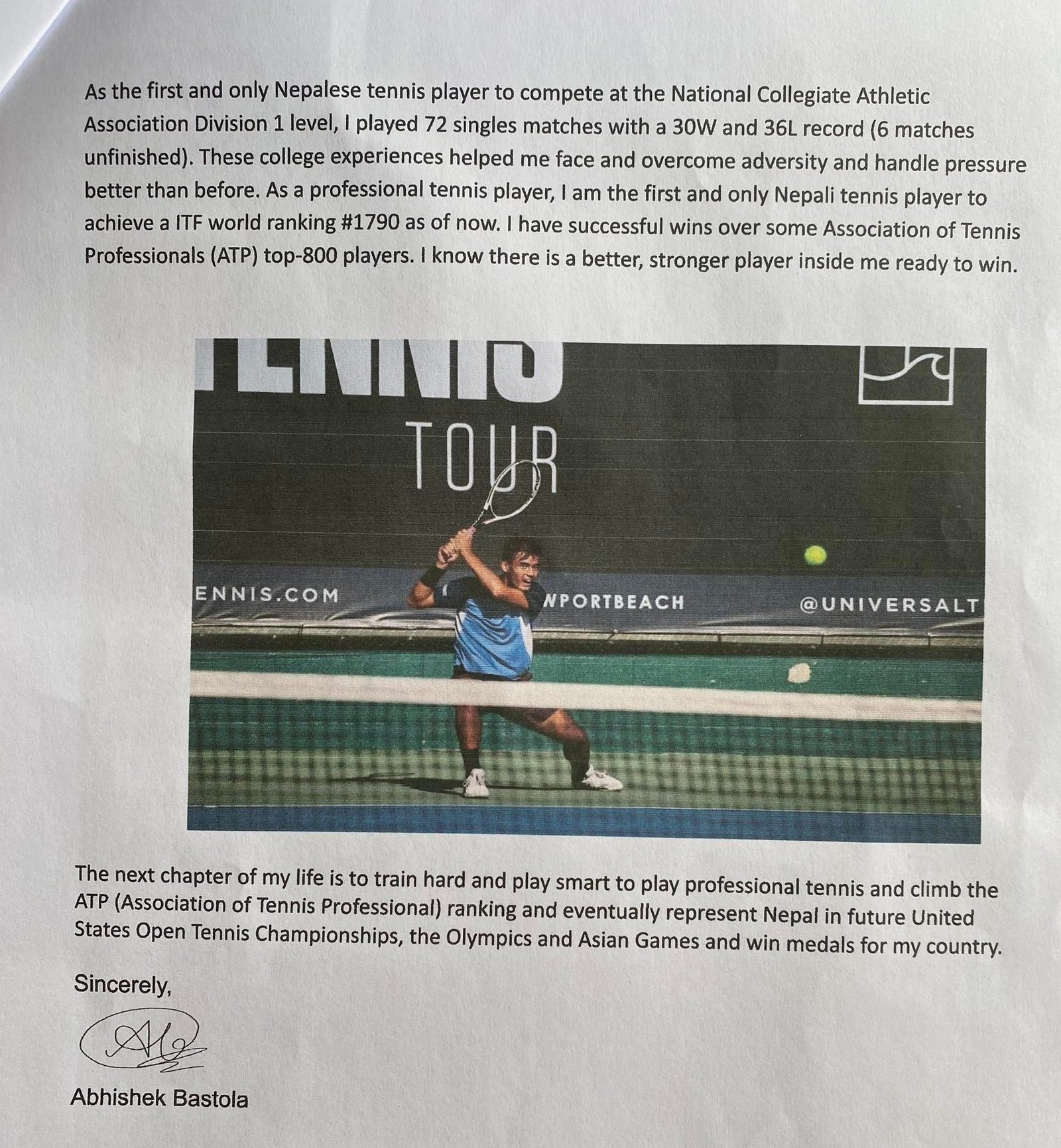 पोखराबाट टेनिस खेल्न सुरु गरेका बास्तोला नेपालका लागि पहिलो पटक आइटिएफको वरियतामा पर्न सफल भएका हुन् । अमेरिकामा नै अध्ययन गर्दै आइरहेका २३ वर्षिय उनले विभिन्न अन्तर्राष्ट्रिय प्रतियोगिता खेलेका छन् । अमेरिकामा व्यवसायीक रुपमा टेनिस खेल्दै आएका अभिषेक नेपाली खेलाडी टेनिस खेलाडीमा आइटिएफ वरियताको यो स्थानमा उक्लिन सफल एक मात्र खेलाडी हुन् ।