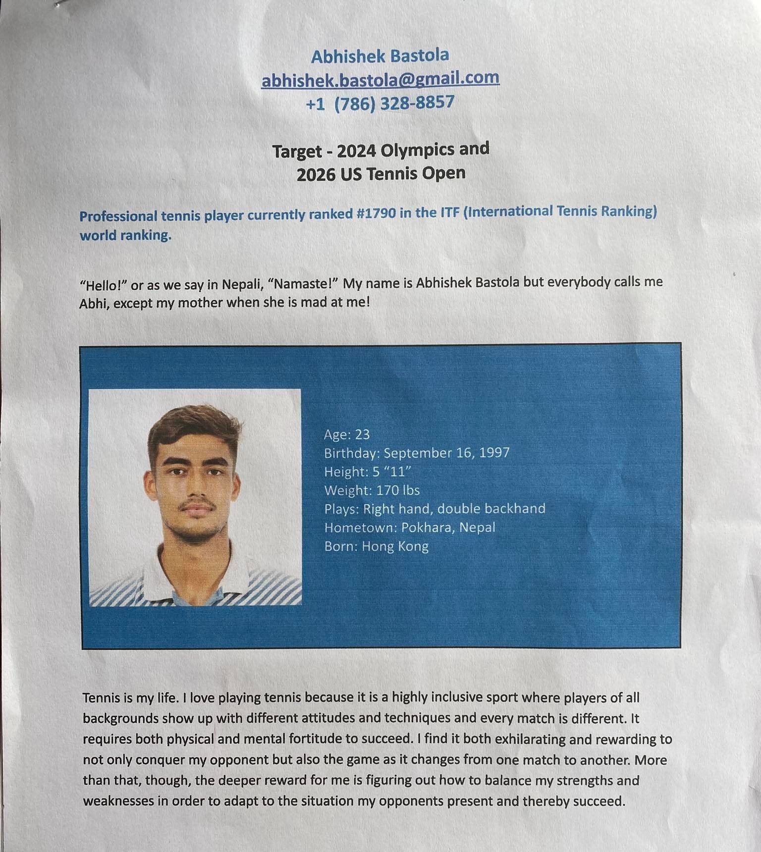 पोखराबाट टेनिस खेल्न सुरु गरेका बास्तोला नेपालका लागि पहिलो पटक आइटिएफको वरियतामा पर्न सफल भएका हुन् । अमेरिकामा नै अध्ययन गर्दै आइरहेका २३ वर्षिय उनले विभिन्न अन्तर्राष्ट्रिय प्रतियोगिता खेलेका छन् । अमेरिकामा व्यवसायीक रुपमा टेनिस खेल्दै आएका अभिषेक नेपाली खेलाडी टेनिस खेलाडीमा आइटिएफ वरियताको यो स्थानमा उक्लिन सफल एक मात्र खेलाडी हुन् ।