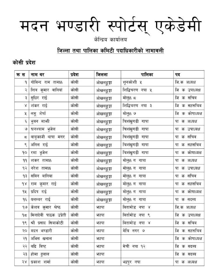 पोखरा स्पोर्टस । मदन भण्डारी स्पोर्टस एकेडेमीले जिल्ला कमिटिहरुलाई पूर्णता दिएको छ ।