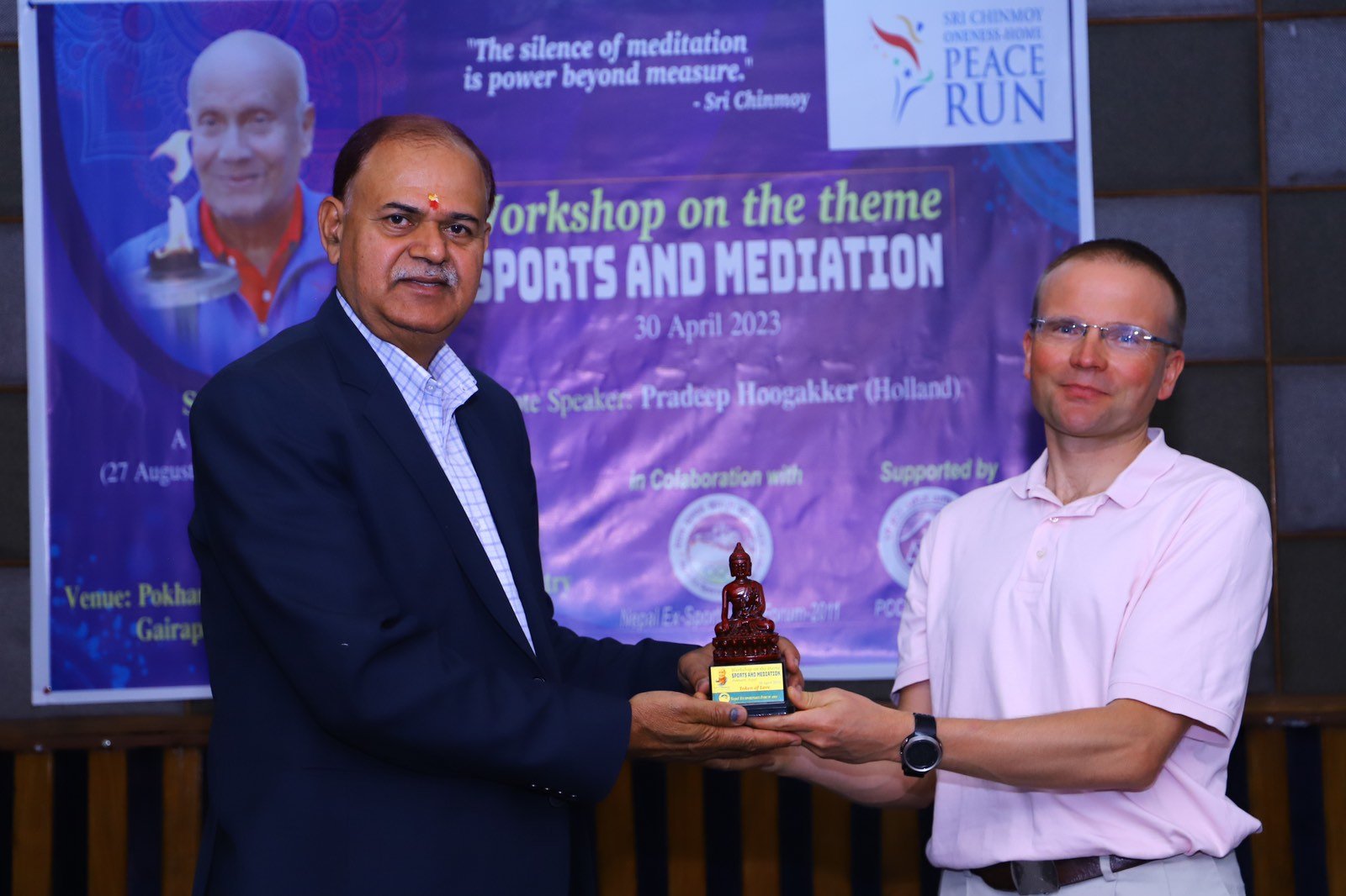 उक्त कार्यक्रमा प्रमुख वक्ताका रुपमा आफ्ना भनाई राख्दै मास्टर श्री चिनमोइका पथ प्रदर्शक तथा ३१०० माइलका धावक प्रदिप होगाकरले खेलकुदमा ध्यान महत्वपूर्ण रहने बताए । उनले भने–“मानवको सफल जिवनका लागि ध्यान जति आवश्यक छ । त्यती नै खेलकुदका लागि पनि । ध्यान मात्रै यस्तो चिज हो जहाँ बाट जिवनको उचाई प्राप्त हुन्छ र जित संगै खुसीयाली पनि ।”