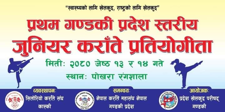 पोखरा स्पोर्टस । गण्डकी प्रदेश स्तरिय प्रथम जुनियर कराते प्रतियोगिता यहि जेठ १३ र १४ गते पोखरामा हुने भएको छ ।
