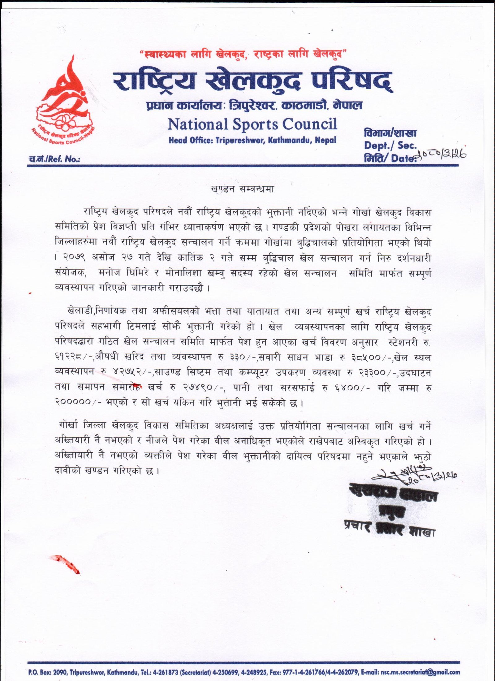 पोखरा स्पोर्टस । राष्ट्रिय खेलकुद परिषद (राखेप)ले गोरखा जिल्ला खेलकुद विकास समितिले पेश गरेका बिल अनाधिकृत र झुठो रहेको र भुक्तानी नहुने भन्दै विज्ञप्ती जारी गरेको छ ।