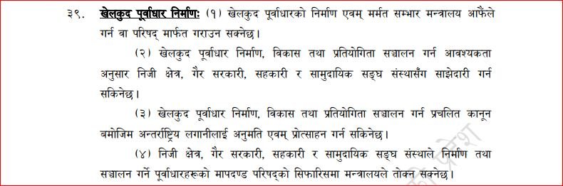 प्रदेश खेलकुद विकास ऐन २०७७ को परिच्छेद ८ को दफा ३९ मा खेलकुद पूर्वाधार निर्माण कसले गर्ने भन्ने बारे स्पष्ट हुँदा हुँदै क्षेत्रधिकार भन्दा बाहिर गएर मन्त्रालयले बजेट ल्याइएको छ । सो ऐनको दफा ३९ को उपदफा १ मा भनिएको छ, “खेलकुद पूर्वाधारको निर्माण एवम् मर्मत सम्भार मन्त्रालय आफैंले गर्न वा परिषदमार्फत् गराउन सक्नेछ ।“ यो उपदफाले स्पष्ट रुपमा मन्त्रालय स्वंय वा खेलकुद परिषद्ले खेल पूर्वाधार निर्माण गर्न सक्ने उल्लेख गरे पनि चालु आर्थिक वर्षमा परिषदले पूर्वाधार निर्माणका लागि बजेट पाएको छैन् । निर्माण र मर्मतका सम्पूर्ण बजेट सामाजिक विकास शाखा कार्यालय अन्तर्गत रहेको छ ।