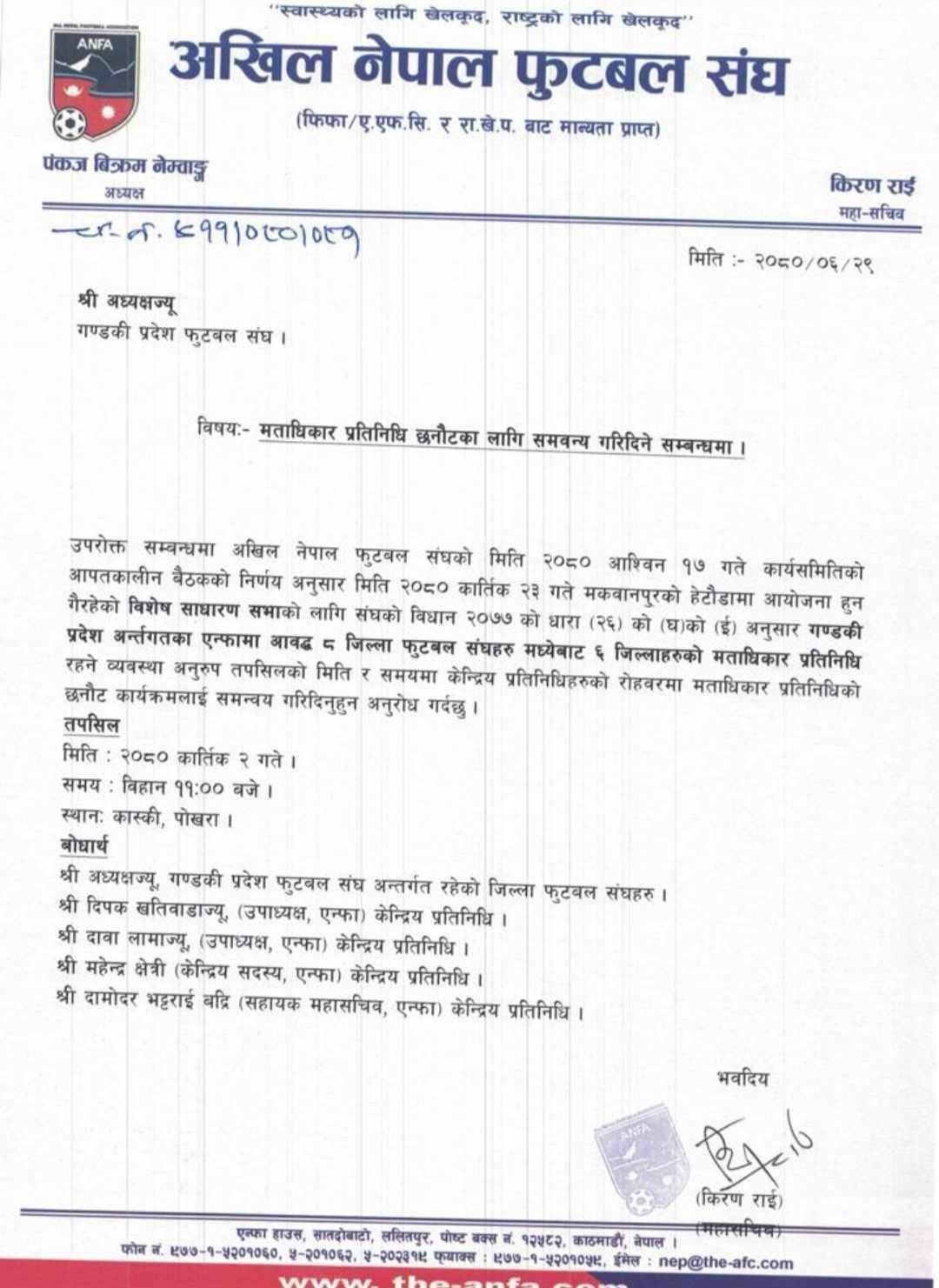 अखिल नेपाल फुटबल संघ (एन्फा)को विशेष साधारणसभाका लागि संघले जिल्ला मताधिकार प्रनिनिधि छनौट सम्पन्न गरेको हो । सो अन्तर्गत गण्डकी प्रदेशका ६ जिल्ला मताधिकारका लागि छनौट भएका छन् ।