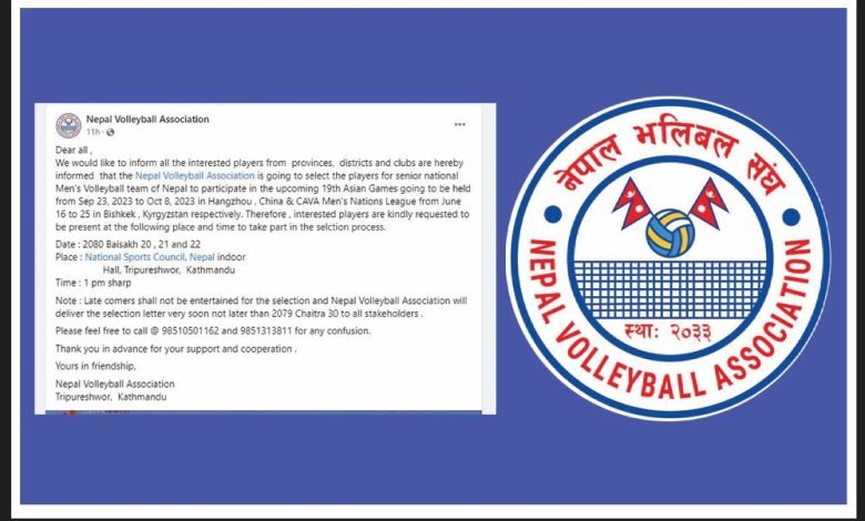 चिनको होङझाउमा आगामी सेप्टेम्वर २३ देखि अक्टोबर ८ सम्म आयोजना हुने १९ औं एसियाली खेलकुद र किग्रीस्तानमा जुन १६ देखि २५ सम्म आयोजना हुने काभा मेन्स नेसन्स् लिगका लागि संघले सूचना प्रकाशित गरेको हो ।
