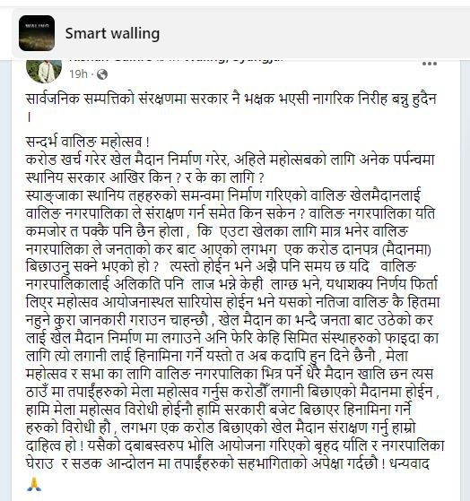 यता वालिङ कै केही यूवाहरुले करौडौ खर्च गरेर निर्माण गरिएको खेल मैदान मेला/महोत्सवका नाममा विर्गान नहुने भन्दै विरोधमा उत्रिएका छन् । ‘स्मार्ट वालिङ’ सामाजिक सञ्जालको पेजमा भनिएको छ–“जनता बाट उठेको करलाई खेल मैदान निर्माणमा लगाउने अनि फेरि केहि सिमित संस्थाहरुको फाइदाका लागि त्यो लगानी लाई हिनामिना गर्ने यस्तो त अब कदापि हुन दिने छैनौ ।”
