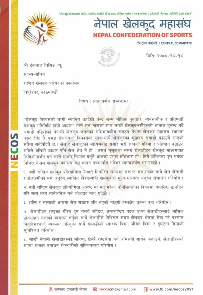 पोखरा स्पोर्टस । नेकपा एमाले निकट नेपाल खेलकुद महासंघ (नेकोस)ले राष्ट्रिय खेलकुद परिषद (राखेप)का सदस्य सचिव टंकलाल घिसिङलाई ज्ञापनपत्र बुझाउँदै १० औं राष्ट्रिय खेलकुद प्रतियोगिता निर्धारित समयमा गर्न माग गरेको छ ।