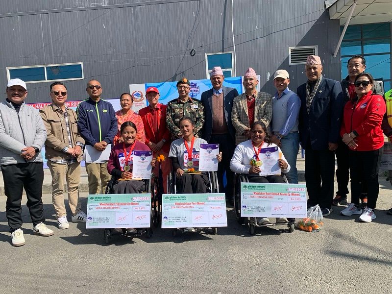 यस्तै महिलातर्फको ह्विल चेयर दौड काठमाण्डौकी ऐश्वर्य कुमारी कुमालले जितेकी छन् । उनले १००० मिटरको दौड ४ मिनेट ९.८ सकेण्डमा पार गरिन् । यसै गरी महिलातर्फ काठमाण्डौकी पेमा छोक्पा गुरुङ ४ मिनेट ५२.१ मिनेटमा दौड पुरा गरी दोश्रो भइन् भने पोखराकी अञ्जु बराल तेश्रो भइन् । उनले उक्त दुरी ६ मिनेट ४४.५ सेकेण्डमा पार गरिन् ।