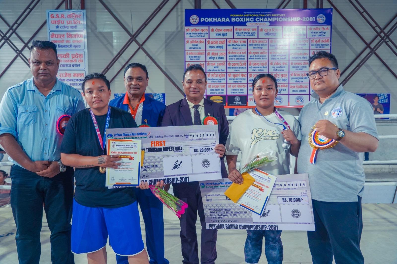 विजेता र उपविजेता खेलाडीलाई पोखरा महानगरपालिका प्रमुख धनराज आचार्य, पोखरा महानगर खेलकुद विकास समितिका अध्यक्ष दिपकबहादुर गोदार, नेपाल बक्सिङ संघका केन्द्रिय अध्यक्ष राम अवाले, केन्द्रिय उपाध्यक्ष किरण श्रेष्ठ, रामबहादुर गिरी, गणेशबहादुर भट्टराई, महासचिव मानबहादुर भण्डारी, नेपाल बक्सिङ संघ गण्डकी प्रदेश अध्यक्ष विद्या प्रसाद मर्सानी, जिल्ला अध्यक्ष सुमनकुमार श्रेष्ठ, महानगर बक्सिङ संघका सचिव बुद्ध गुभाजु लगायतले पुरस्कार वितरण गरेका थिए ।