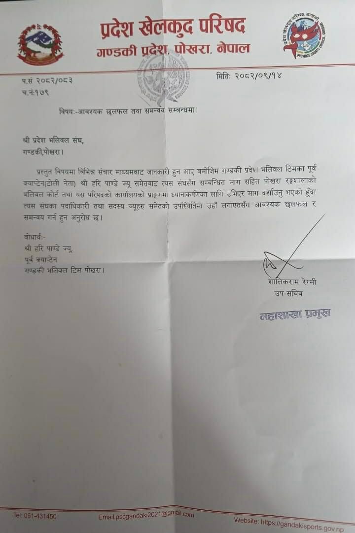 परिषदले गण्डकी प्रदेश भलिबल संघलाई पत्र लेख्दै छलफलका लागि बोलाएको हो । गण्डकी भलिबल टिमका पूर्व कप्तान हरि पाण्डेलाई बोधार्थ गरिएको पत्रमा छलफलका लागि बोलाइए पनि मिति भने तोकिएको छैन । परिषदका उपसचिब शालिकराम रेग्मीले दुबै पक्षलाई वार्तामा बोलाउँदै पत्रमा हस्ताक्षर गरेका छन् ।