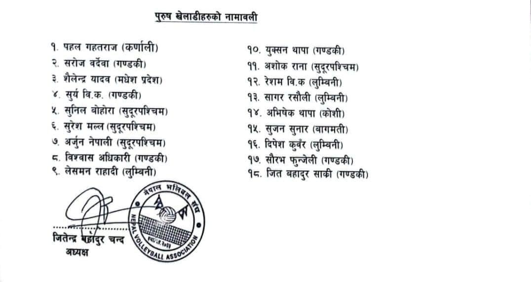 गण्डकी प्रदेशबाट छनौटमा पर्ने खेलाडी सरोज बर्देवा, सूर्य विक, विश्वास अधिकारी, युक्सन थापा र जित बहादुर सार्की रहेका छन् । त्यस्तै लुम्बिनीबाट लेसमन राहादी, रेशम विक, सागर रसौली, दिपेश कुंवर र सौरभ फुन्जेली रहेका छन् । सुदुर पश्चिमबाट सुनिल बोहरा, अर्जुन नेपाली, अशोक राना र सुरेश मल्ल छन् ।