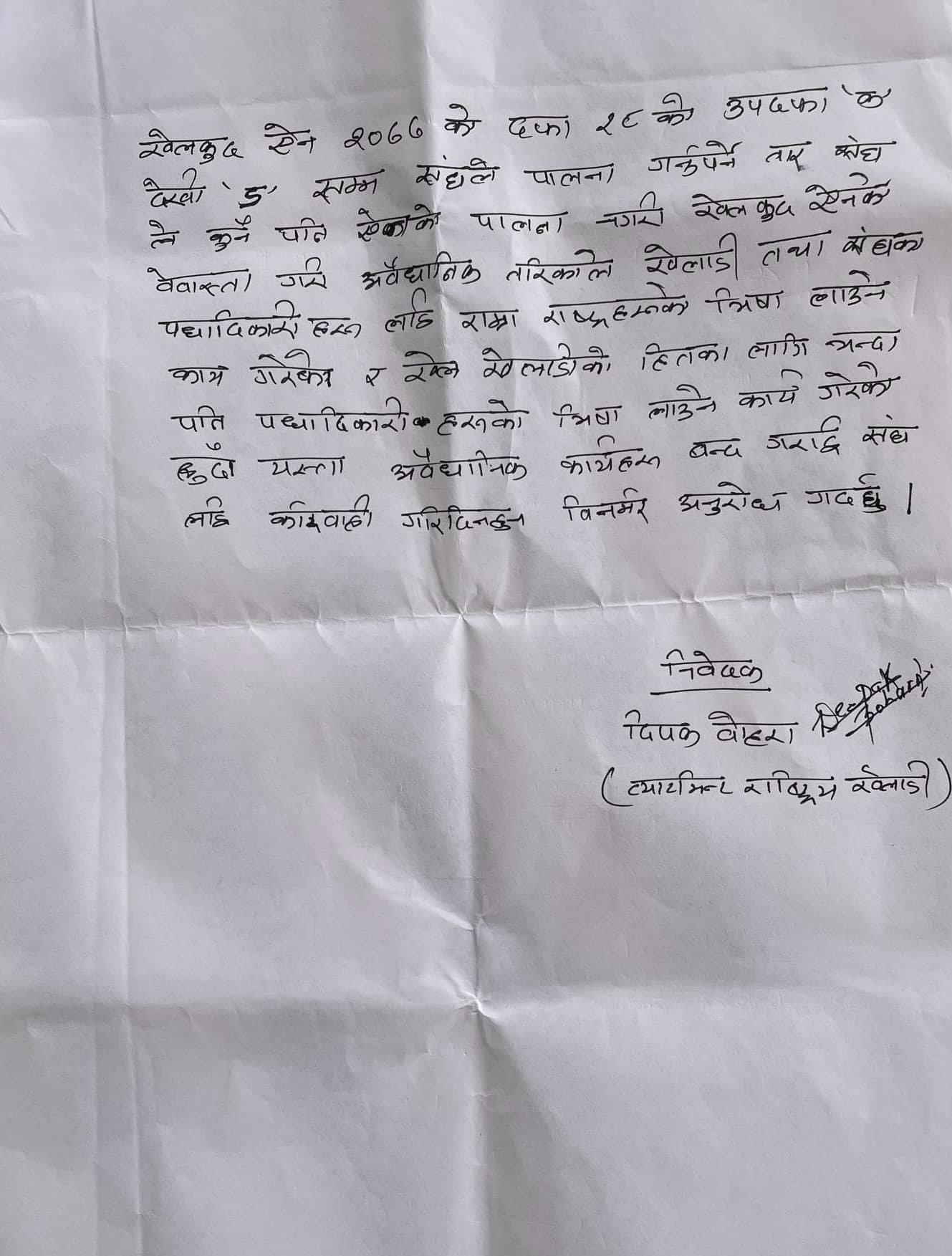 नेपाल नं ५ बरियता राष्ट्रिय खेलाडी दिपक बोहोराले राखेपमा संघले खेलाडी विरुद्ध गरेका कृयाकलापको विरोध जनाउँदै उजुरी दर्ता गरेका हुन् । उनले आफ्नो उजुरीमा संघका पदाधिकारीहरुले मनोमानी रुपमा खेलाडीहरुलाइ छनौट नगरी अन्तर्राष्ट्रिय स्तरका प्रतियोगितामा सहभागितामा पठाउने र खेलाडी भन्दा पनि पदाधिकारीको नाममा धेरै जनालाई विदेश शयर गराउने गरेको आरोप समेत लगाएका छन् ।