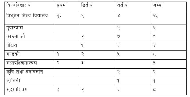 यस्तै ३ स्वर्ण २ रजत र ३ कास्य पदक सहित सुदुरपश्चिम विश्व विद्यालय द्वितीय भएको छ भने २ स्वर्ण र ३ रजत पदक सहित मध्यपश्चिमान्चल विश्व विद्यालय तृतीय भएको छ । सहआयोजक गण्डकी विश्वविद्यालयले १ स्वर्ण सहित २ रजत र ५ कास्य पदक प्राप्त गरेको छ । काठमाण्डौले २ रजत र ७ कास्य हात पार्दा पोखराले १ रजत ३ कास्य पदक प्राप्त गरेको छ । पूर्वान्चाल २ कास्य, कृषि तथा वनविज्ञान २ कास्य र लुम्विनी विश्वविद्यालयले १ कास्य पदकमा चित्त बुझाएका छन् ।