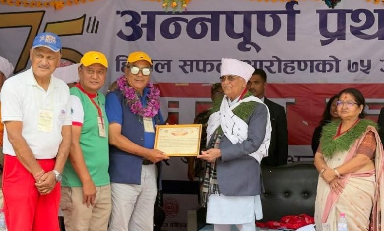 अन्नपूर्ण हिमाल आरोहणको ७५ वर्ष पुगेको अवसरमा उत्तरतर्फ बेस क्याम्पबाट पहिलो पटक सुरू गरिएको अन्नपूर्ण म्याराथनको पहिलो संस्करणमा रुट मापनमा प्राविधिक सहयोग गरेको भन्दै अन्नपूर्ण गाउँ पालिकाले प्रदान गरेको सम्मान पत्र प्रम ओलीले मञ्चका अध्यक्ष दिल बहादुर गुरूङलाई हस्तान्तरण गरेका हुन् । सो अवसरका प्रम ओलीले पहिलो अन्नपूर्ण हिमाल आरोही मौरिस हर्जोगको नाउँमा म्याराथन दौड लगायतका कार्यक्रमहरु आयोवजना हुनु सुखद रहेको बताउँदै यसले नेपाली पर्यटन क्षेत्रको विकास तथा विस्तारमा समेत सहयोग पुग्ने उल्लेख गरे ।