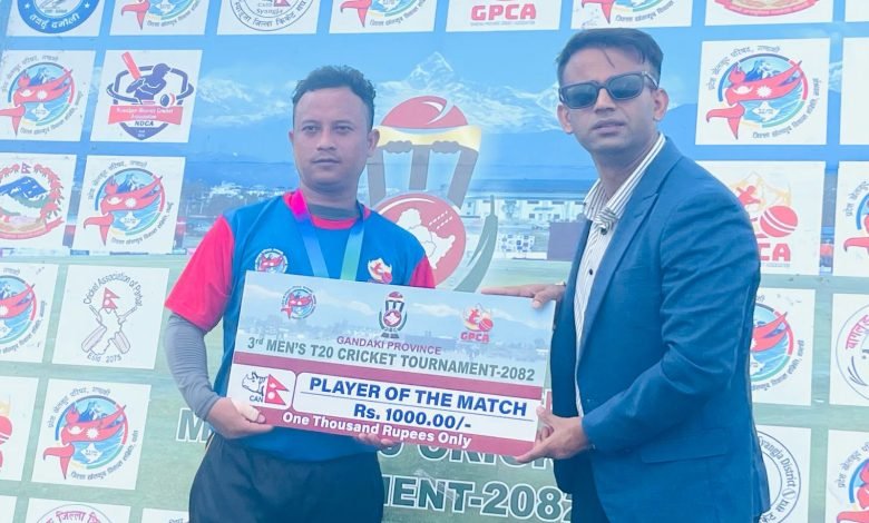 पोखरा स्पोर्टस । गण्डकी प्रदेश तेस्रो पुरुष टि–२० क्रिकेट प्रतियोगितामा पर्वतले नवलपुर विरुद्ध शनसनीपूर्ण जित हात पारेको छ । पोखरा क्रिकेट खेल मैदानमा जारी प्रतियोगितामा पर्वतले नवलपुरलाई १५ रनले पराजित गर्दै महत्वपूर्ण जित हात पारेको हो ।