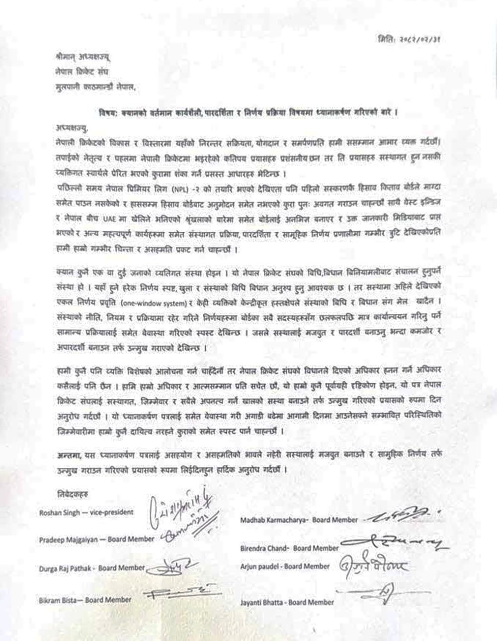 ध्यानाकर्षण पत्रमा एनपीएल-२ को पहिलो संस्करणकै हिसाब बोर्डले माग्दा पाउन नसकेको उल्लेख गर्दै हालसम्म पनि सो हिसाब किताब बोर्डबाट अनुमोदन नभएको उल्लेख गरेका छन् । साथै उनीहरुले नेपालले वेस्ट इन्डिजसँग खेल्ने टी-२० सिरिजको जानकारी पनि मिडियाबाट पाएको बताउदै प्रक्रिया, पारदर्शिता र सामुहिक निर्णय प्रणालीमा गम्भीर त्रुटी देखिएको उल्लेख गरेका छन् ।