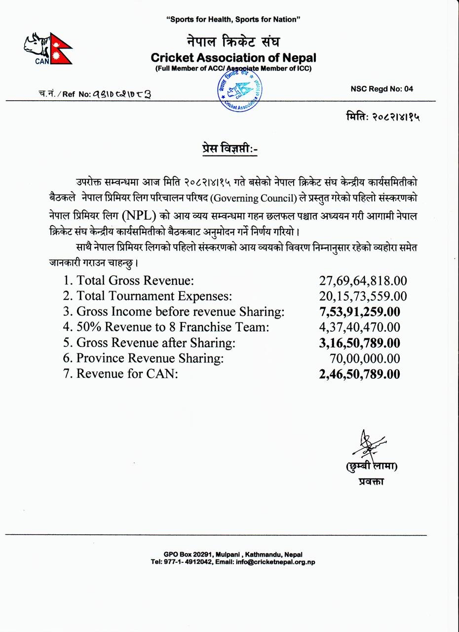पोखरा स्पोर्ट्स । नेपाल क्रिकेट संघ (क्यान) ले नेपाल प्रिमियर लिग (एनपीएल) को पहिलो संस्करणको आयव्यय विवरण सार्वजनिक गरेको छ।