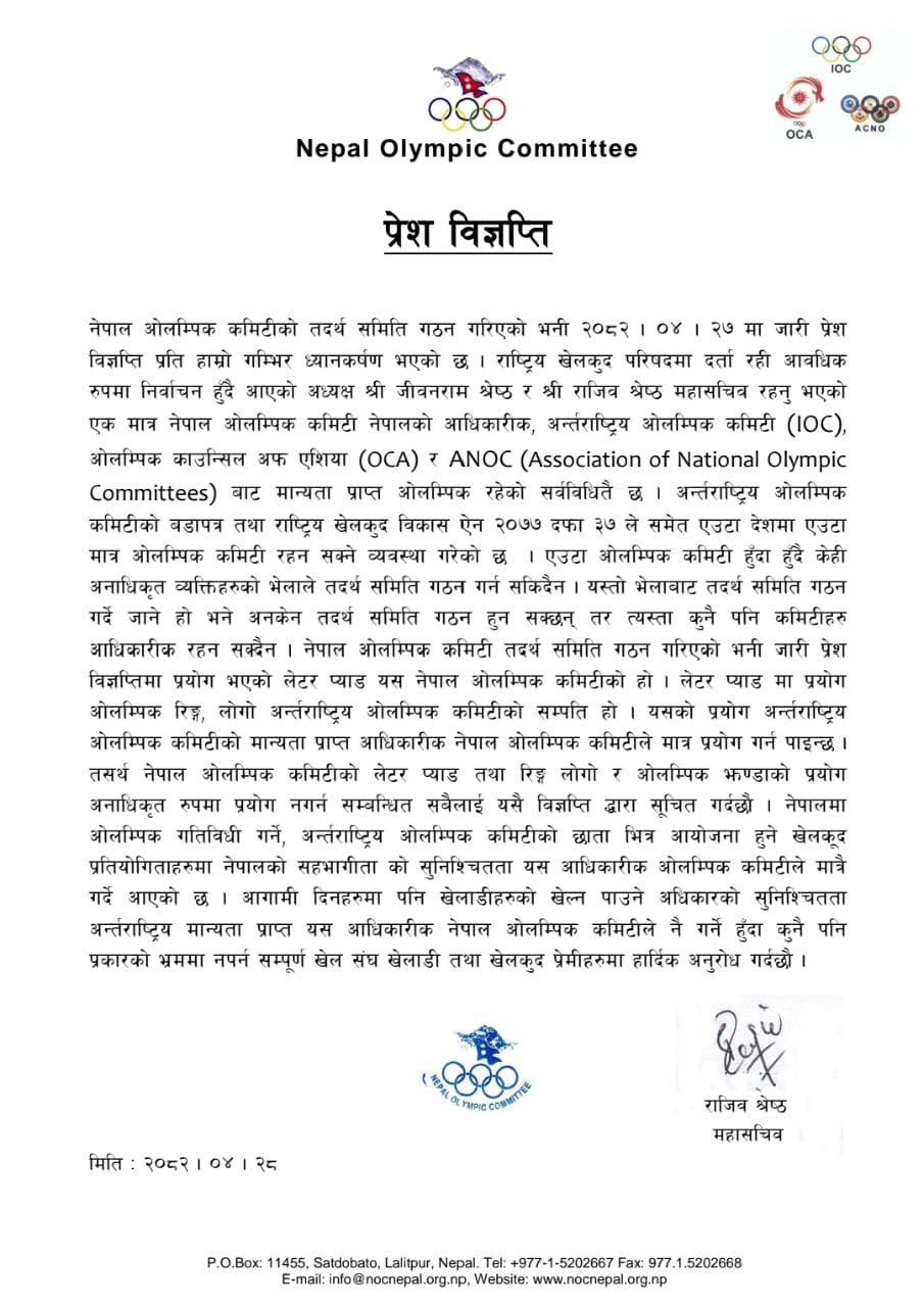 जारी विज्ञप्तीमा राष्ट्रिय खेलकुद परिषदमा दर्ता रहि अध्यक्ष जिवनराम श्रेष्ठ र महासचिव राजिव श्रेष्ठ रहेको एक मात्र ओलम्पिक कमिटि र सो कमिटि नै अन्तर्राष्ट्रिय ओलम्पिक कमिटि, ओलम्पिक काउन्सिल अफ एसिया र एशोसियसन अफ नेशनल ओलम्पिक कमिटिबाट मान्यता प्राप्त रहेको जनाइएको छ ।