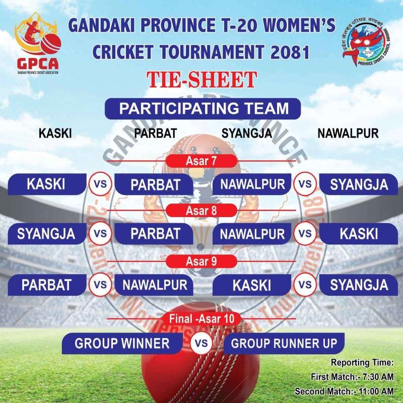प्रदेश खेलकुद परिषद गण्डकीको आयोजना तथा प्रादेशिक क्रिकेट संघ गण्डकीको ब्यवस्थापनमा उक्त प्रतियोगिता यहि असार ७ गते सुरु हुने प्रतियोगितामा चार टिमले सहभागिता जनाएका हुन् ।