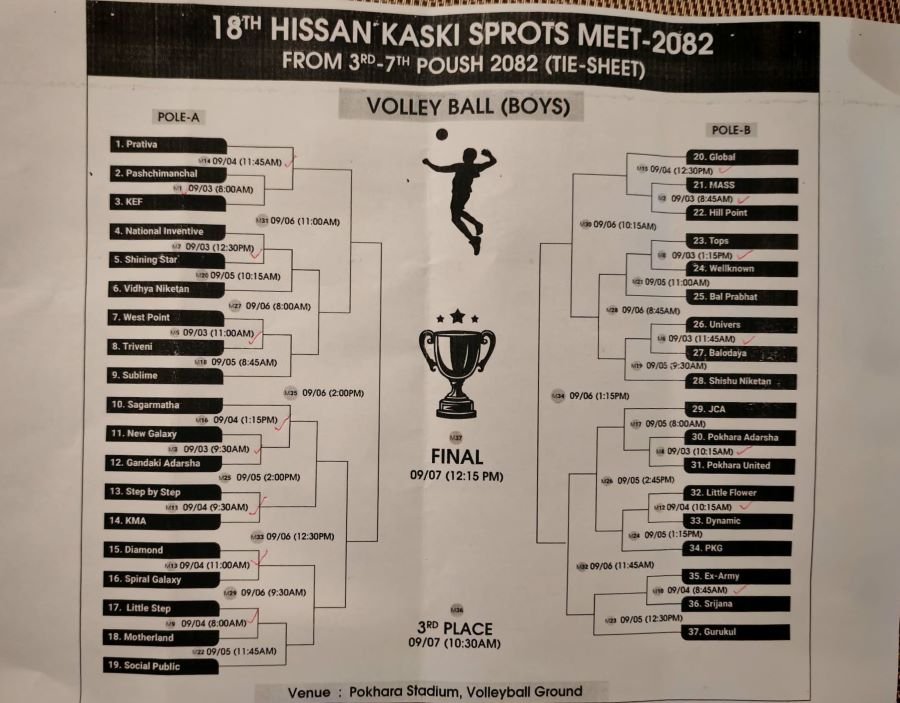 हिसान कास्की स्पोर्टस मिट अन्तर्गत छात्र/छात्रा बास्केटबल, भलिबल, व्याडमिन्टन र टेबुल टेनिसका प्रतिष्पर्धा हुने भएको हिसान कास्कीका सचिब किरण सापकोटाले जानकारी दिए । प्रतियोगितामा कक्षा ११–१२ छात्र भलिबलमा ३८ र छात्रातर्फ २४ टिमहरुको सहभागिता हुने छ ।