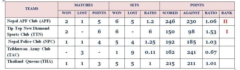 महिलातर्फ नेपाल आर्मी क्लबले आफ्नो अन्तिम खेलमा पाहुना टोली थाइल्याण्ड क्विन्ससँग सामना गर्नेछ । यसैगरी महिलातर्फकै अर्को खेलमा टिपटप न्यू डायमण्ड युथ स्पोर्ट्स क्लब र नेपाल पुलिस क्लब आमनेसामने हुनेछन् । आर्मी भने लगातार तीन खेलमा पराजित हुदै प्रतियोगिताबाट बाहिरिएको छ भने थाइल्याण्डले एकमा जित र एक खेलमा हार बेहोरेको छ ।