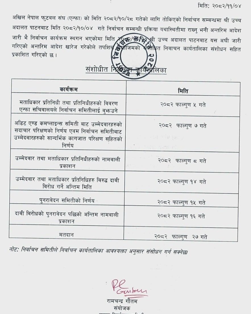 पोखरा स्पोर्ट्स । अखिल नेपाल फुटबल संघ (एन्फा)ले आफ्नो निर्वाचन सम्बन्धी कार्यतालिका संशोधन गरिएको भन्दै नयाँ तालिका प्रकाशन गरेको छ । यसअघि तय गरिएको निर्वाचन प्रक्रियामा सर्वोच्च अदालत पाटनबाट अन्तरिम आदेश जारी भएपछि प्रक्रिया यथास्थितिमा राखिएको थियो । तर उक्त अन्तरिम आदेश खारेज भएपछि संशोधित निर्वाचन कार्यतालिका सार्वजनिक गरिएको एन्फाले जनाएको हो ।
