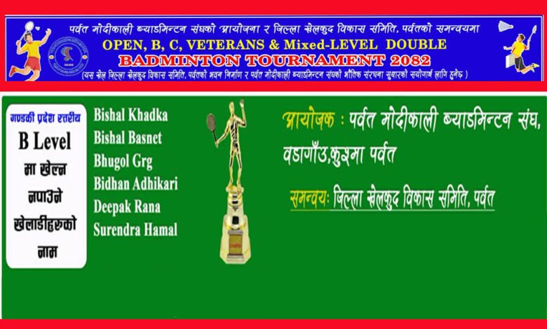 पोखरा स्पोर्ट्स । पर्वतको कुश्मामा ब्याडमिन्टन प्रतियोगिता आयोजना हुने भएको छ। पर्वत मोदिकाली ब्याडमिन्टन संघको आयोजनामा तथा जिल्ला खेलकुद विकास समिति पर्वतको समन्वयमा प्रतियोगिता सञ्चालन हुन लागेको हो ।